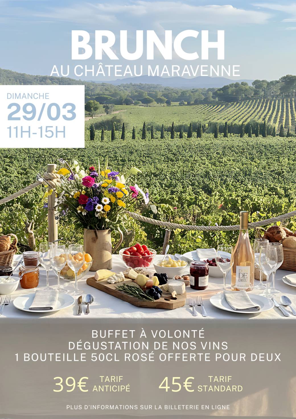 2026-03-29 11:00:00 2026-03-29 15:00:00 Europe/Paris Maravenne Brunch Reservations on : http://www.maravenne.com -- Les brunchs arrivent au Château Maravenne !    Offrez-vous une parenthèse gourmande et conviviale sur notre terrasse avec vue mer ☀️   ✨ Transformez votre dimanche en instant de plaisir et de partage ! Les places étant limitées, pensez à réserver votre table.   Inclus : - Brunch à volonté - Dégustation de nos vins - Jus de fruits, cafés et thés - Une bouteille de Grande Réserve Rosé 2024 (50 cl) pour deux personnes   En option sur place : Découvrez également les vins du Château Maravenne (rosé, blanc et rouge).   ☀️ À noter : L’événement se déroule en extérieur. Pensez à prévoir protection solaire ou petite veste selon la météo.   Réservez vite et venez savourer un dimanche gourmand face à la mer !         477 Route de Valcros, La Londe-les-Maures, France Château Maravenne