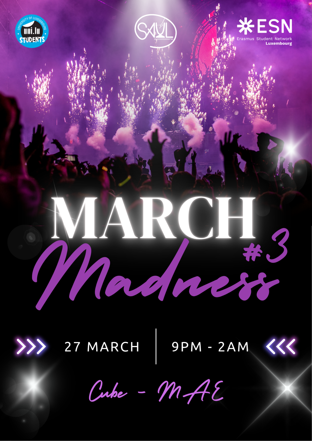 ESN Luxembourg and SAUL invite you to celebrate the start of the summer semester with our event 'March Madness #3' at the Cube in the Maison Des Arts et Etudiants.