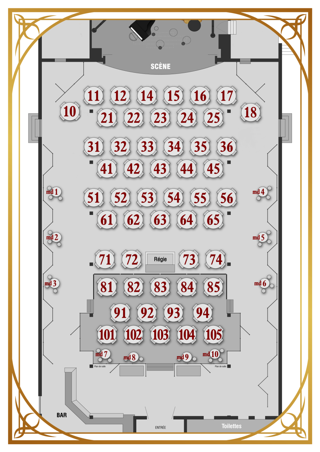 Notre festival vous accueille dans une ambiance cabaret, à des tables de 4 personnes (à l'exception des mange-debout, qui accueillent 2 ou 3 personnes (voir plan de salle ci-dessous)).