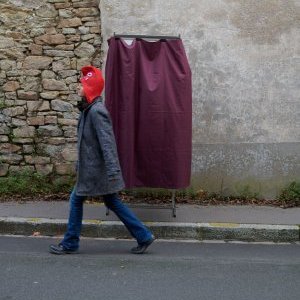 De là, imaginons une sorte d’échange entre l’humain·e et l’objet, entre une puis des citoyen·ne·s et le symbole de nos démocraties, avec sa gueule de cabine d’essayage ou de théâtre ambulant, c’est selon.