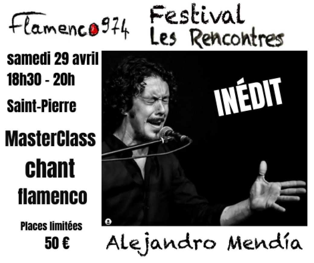 Premier festival de flamenco à La Réunion : Les Rencontres Flamenco974 du 13 avril au 20 mai. Inédit : le chanteur Alejandro Mendía propose de découvrir le chant flamenco à des stagiaires déjà initiés aux techniques vocales.