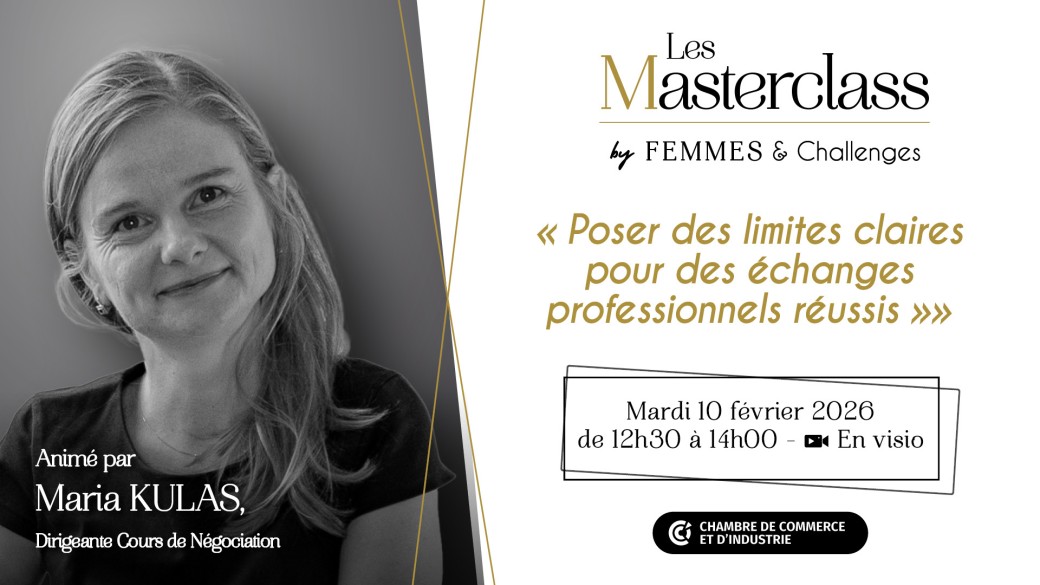 2026-02-10 12:30:00 2026-02-10 14:00:00 Europe/Paris Masterclass #20 : Posez des limites claires pour des échanges professionnels réussis ! Reservations on : https://www.billetweb.fr/masterclass-f-c-20 -- Trop de discussions commerciales dérapent… non pas à cause du client, mais à cause d’un cadre flou, d’une sur-adaptation permanente ou de la peur de perdre l’opportunité.   Le 10 février, Maria Kulas, coach en négociation et communication stratégique, vous aide à reprendre la main avec une approche claire, structurée et sécurisante.   Au programme : - Poser un cadre lisible qui protège vos tarifs et évite les renégociations émotionnelles - Repérer les signaux de sur-adaptation qui fragilisent votre posture - Comprendre les différents profils d’interlocuteurs pour adapter votre communication avec justesse - Sortir du réflexe de justification et installer une posture stable, même dans l’inconfort - Ne plus démarrer une discussion par le prix, mais par votre valeur - Dire non sans casser la relation et arrêter le marchandage comme mode de fonctionnement   Une session concrète pour développer une communication assertive, renforcer votre crédibilité et négocier avec sérénité, fermeté… et … - CCI Normandie