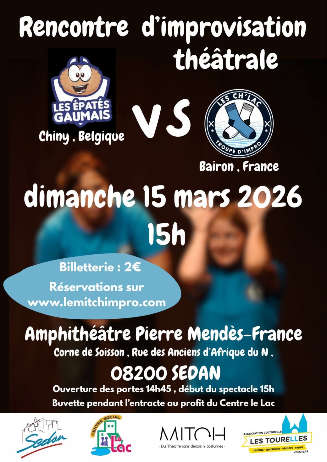 Les Ch'Lac rencontrerons l'équipe des Épatés Gaumais , une équipe qui nous vient tout droit de Belgique , pour un match d'impro totalement fou et inattendu à Sedan à l'amphithéâtre Pierre Mendès France le dimanche 15 mars à 15h.