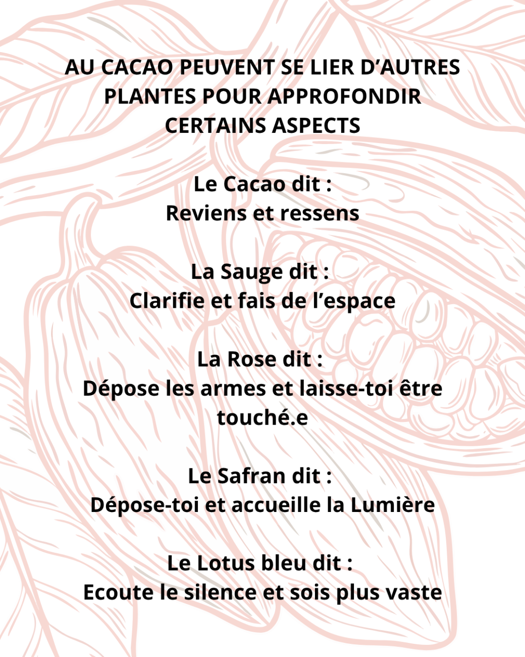 En soutien, d'autres plantes médecine peuvent accompagner le processus comme la rose, la sauge, le safran et le lotus bleu. Ecoute juste leur résonnace en toi.