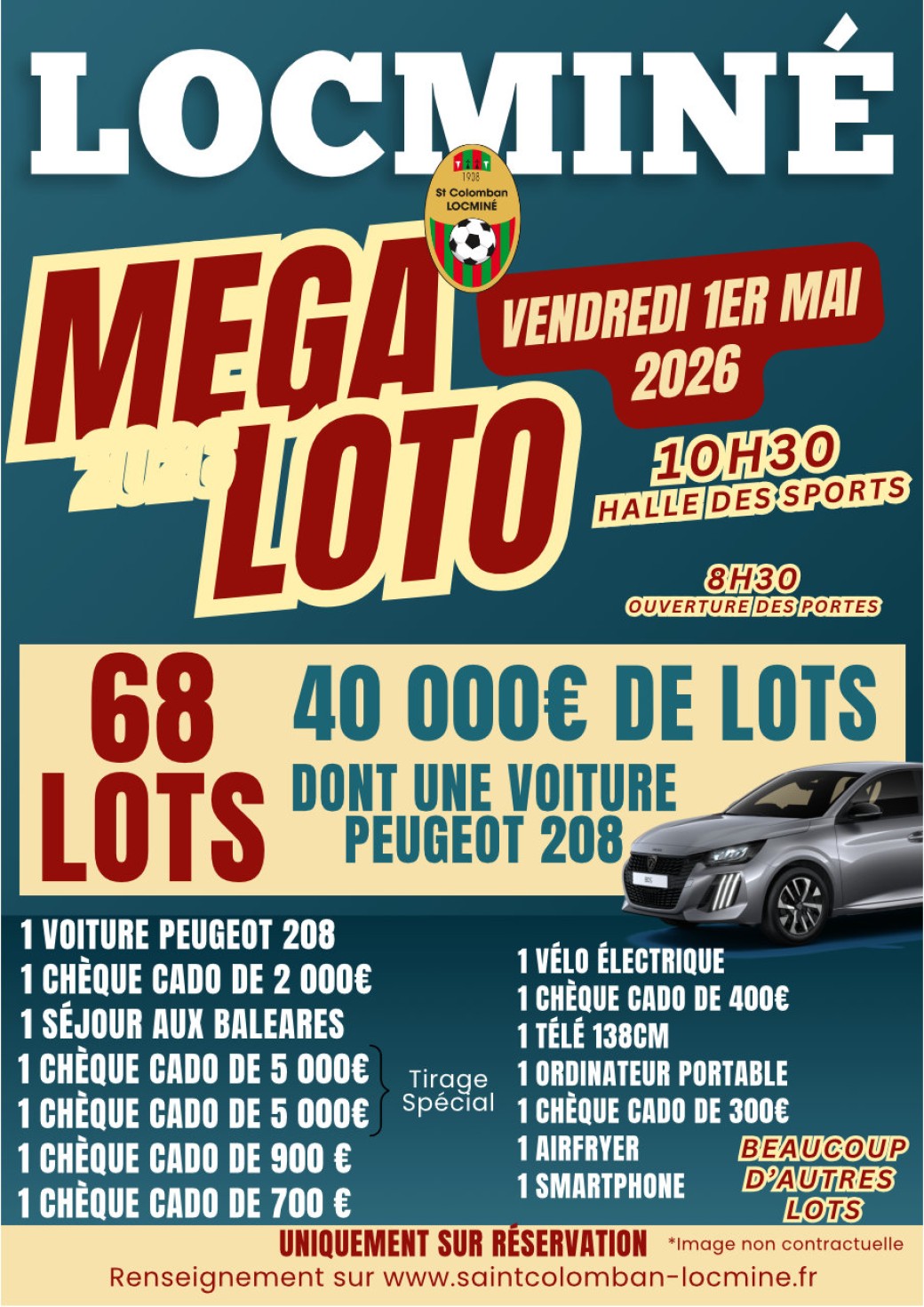 2026-05-01 10:30:00 2026-05-01 10:30:00 Europe/Paris Méga Loto 2026 Reservations on : https://saintcolomban-locmine.fr -- Comme chaque année, la Saint-Colomban Locminé organise son Méga Loto le 1er mai, réunissant plus de 2 000 joueurs tentant leur chance de remporter le gros lot.   Traditionnel évènement de début mai, il vous est possible de vous inscrire en ligne via cet espace. Vous pourrez en quelques clics sélectionnez votre place sur le plan. Rue de la Bouillerie, Locminé, France Saint Colomban Locminé - Commission Loto