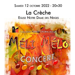 2022-11-12 20:30:00 2022-11-12 22:00:00 Europe/Paris Méli Mélo Réservation sur : http://www.chantchoral-crechendo.org -- Méli mélo est un concert choral proposé par la chorale Crèche n'Do de La Crèche (79260). Au programme des pièces de différentes époques et styles musicaux interprétés dans différentes langues européennes et extra-européennes, ainsi que des chansons françaises harmonisées pour choeur à voix mixtes. Le concert sera dirigé par Hana Kozlova, cheffe de choeur d'origine tchèque installée en France depuis cinq ans. Le concert est organisé et mis en lumière par l'association CHANT CHORAL de La Crèche dans l'église Notre Dame des Neiges de la commune. La Crèche, France Association CHANT CHORAL