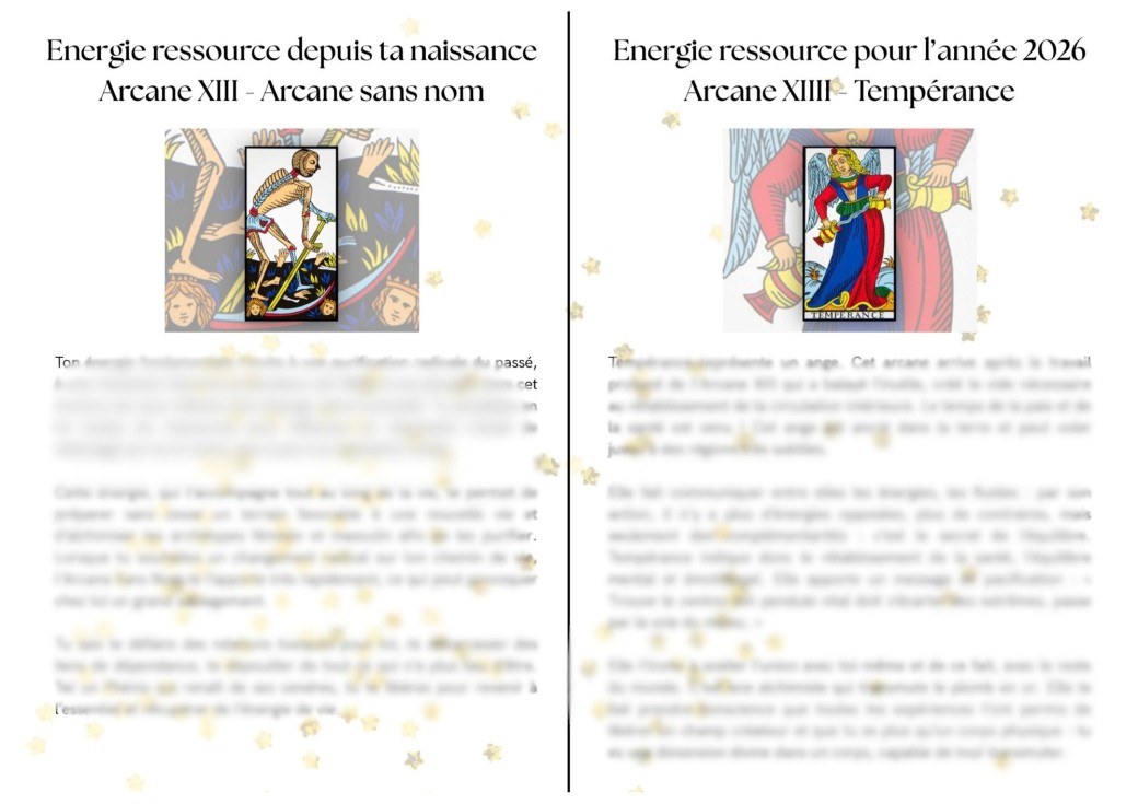 Afin de célébrer la nouvelle année qui s'invite, je vous propose de recevoir, dans votre boîte mail, un joli flyer en format pdf vous délivrant les messages des arcanes correspondant à votre énergie ressource (celle qui vous accompagne depuis votre naissance et qui est tout le temps disponible pour vous) et l'énergie qui s'invite pour vous particulièrement en 2026. Une jolie idée cadeau à se faire ou à offrir (en l'imprimant sur un joli papier), à un prix tout doux.