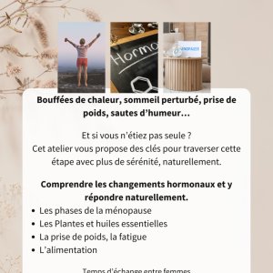 Bouffées de chaleur, sommeil perturbé, prise de poids, sautes d’humeur… Et si vous n’étiez pas seule ? Cet atelier vous propose des clés pour traverser cette étape avec plus de sérénité, naturellement.