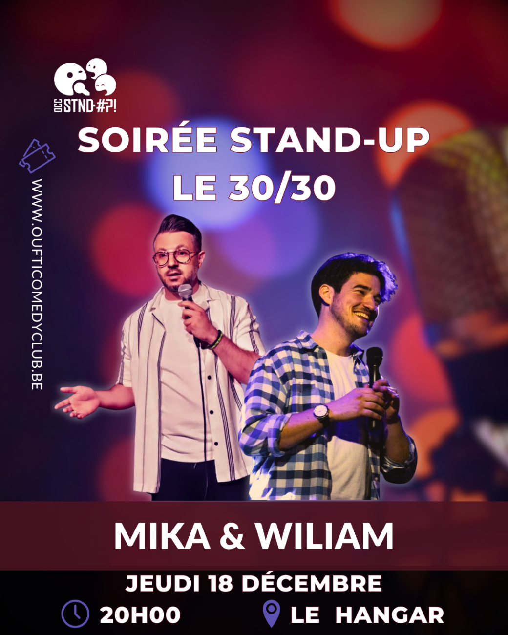 Pour la première fois, Mika et William monteront sur la scène du Hangar avec leur 30/30. Une soirée unique, authentique et 100 % liégeoise, à l’image du Oufti Comedy Club.