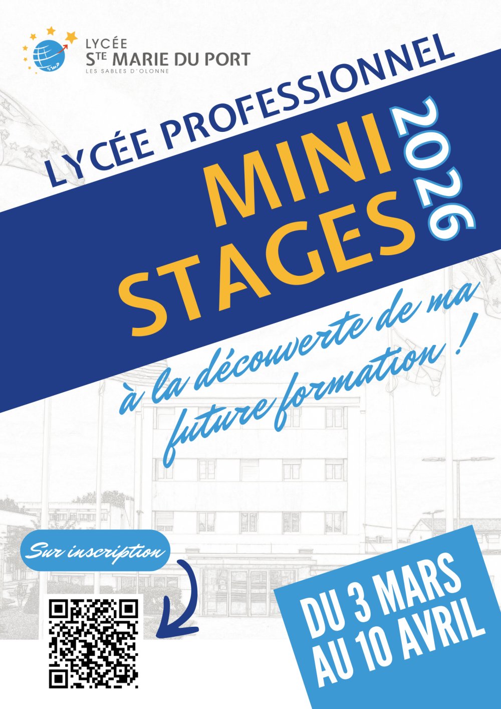 2026-02-14 08:00:00 2026-04-10 17:00:00 Europe/Paris Mini stages - lycée professionnel 2026 Reservations on : https://www.billetweb.fr/mini-stages-lp-2026 -- Afin de sensibiliser votre jeune de 3ème aux différentes formations dispensées par le lycée professionnel de Sainte Marie du Port, nous vous proposons de l'accueillir pour une demi-journée en mini-stage au sein de notre établissement.   Nous vous proposons plusieurs choix de dates et d'horaires possibles. Lors de l'inscription ci-dessous, merci de renseigner les informations d'un responsable légal dans la section "Vos informations" puis celle de l'élève dans "Inscription élève".   Attention : les inscriptions doivent être réalisées 48h avant le stage afin de vous faire parvenir les conventions de stage au préalable.   Au plaisir de recevoir votre jeune très prochainement, Lycée Sainte Marie du Port, Avenue Charles de Gaulle, Les Sables-d'Olonne Mme RAVON, secrétariat des élèves du lycée professionnel
