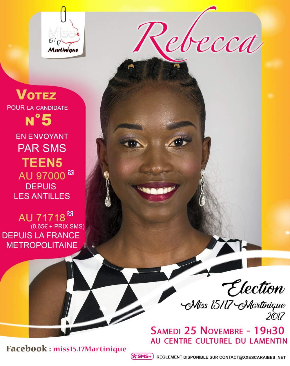 Dès aujourd’hui, rendez vous sur le Facebook Miss 15 - 17 Martinique, sélectionnez votre candidate et votez par sms en envoyant TEEN au 97 000 pour les Antilles ou au 71718 pour la France. service édité par Axxès Interactive. 0,65€ + coût d'un sms