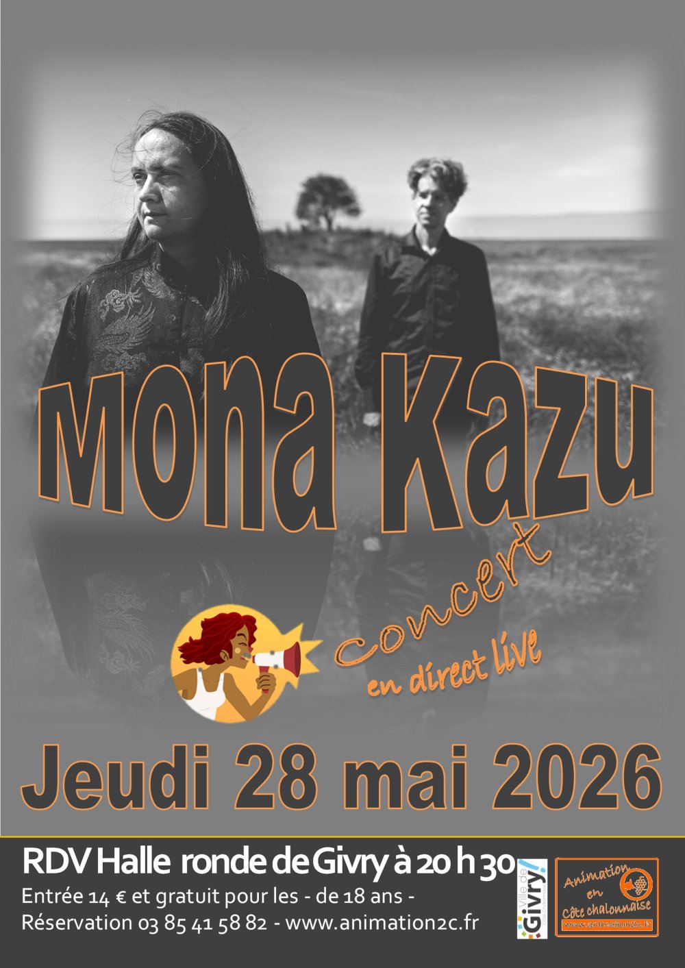 2026-05-28 20:30:00 2026-05-28 22:00:00 Europe/Paris Mona Kazu Reservations on : https://www.billetweb.fr/mona-kazu -- Entre tension sonique et onde mystique, l'univers de Mona Kazu puise son inspiration dans la noise, l'indie rock, la coldwave... avec pour fil conducteur une voix habitée aux multiples facettes. Mona Kazu injecte une large palette de couleurs en vagues sonores et poétiques, où le combat (contre la bêtise, le patriarcat, l'apathie, ses démons…) côtoie l'onirique dans une volonté de dépassement par la beauté qu'on peut trouver en toute chose.   Mona Kazu : Priscille Roy, Clavier et voix - Franck Lafay, guitares, mandoline, programmations, chœurs Halle ronde, Place de la Halle, Givry, France Animation en Côte chalonnaise