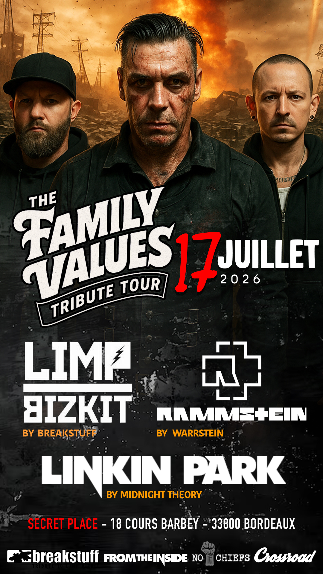 2026-07-17 19:00:00 2026-07-17 23:55:00 Europe/Paris [MONTPELLIER] Concert Tribute - LINKIN PARK | LIMP BIZKIT | RAMMSTEIN Reservations on : https://www.billetweb.fr/montpellier-concert-tribute-linkin-park-limp-bizkit-rammstein -- MONTPELLIER – préparez-vous, ça va être l’apocalypse sonore ! Le Family Values Tribute Tour débarque à la Secret Place le 17 juillet 2026 pour une soirée hors normes.   Au programme : BREAKSTUFF – Tribute à LIMP BIZKIT WARRSTEIN – Tribute à RAMMSTEIN MIDNIGHT THEORY – Tribute à LINKIN PARK    Une affiche explosive qui réunit trois piliers du metal/nu-metal pour une nuit de riffs lourds, d’énergie brute et d’ambiance enragée. La fosse va trembler !   Secret Place – 25 Rue St Exupery – 34430 Saint-Jean-de-Védas   Ouverture des portes : 19h00   Early Birds : 14 € (places limitées) Tarif régulier : 17€ Prévente Tarif sur place (sous réserve de place disponible) : 20€   Attention : La dernière édition du Family Values Tribute Tour au secret place étaient SOLD OUT. Réserve ta place dès maintenant et viens vivre une soirée historique. SECRET PLACE, Rue Saint Exupery, Saint-Jean-de-Védas, France FAMILY VALUES PRODUCTION