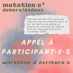2025-11-17 10:00:002025-11-21 16:30:00Europe/BrusselsMutation.s dehors/dedans atelier d'écriture Go#8Reservations on : https://www.billetweb.fr/mutation-s-dehors-dedans-atelier-decriture-go-8