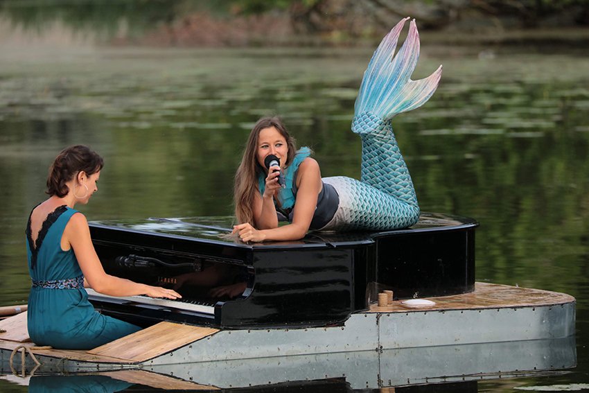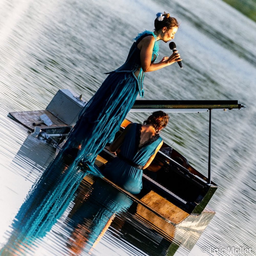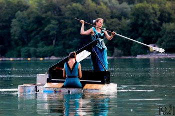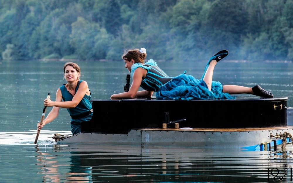 De lac en lac, d'étang en rivière, de port en rivages, laissez-vous enchanter par ce duo poétique inattendu. L'image peut paraître surréaliste mais l'embarcation du pianO du lac, un demi-queue, flotte bel et bien… et la pianiste joue les pieds dans l'eau !