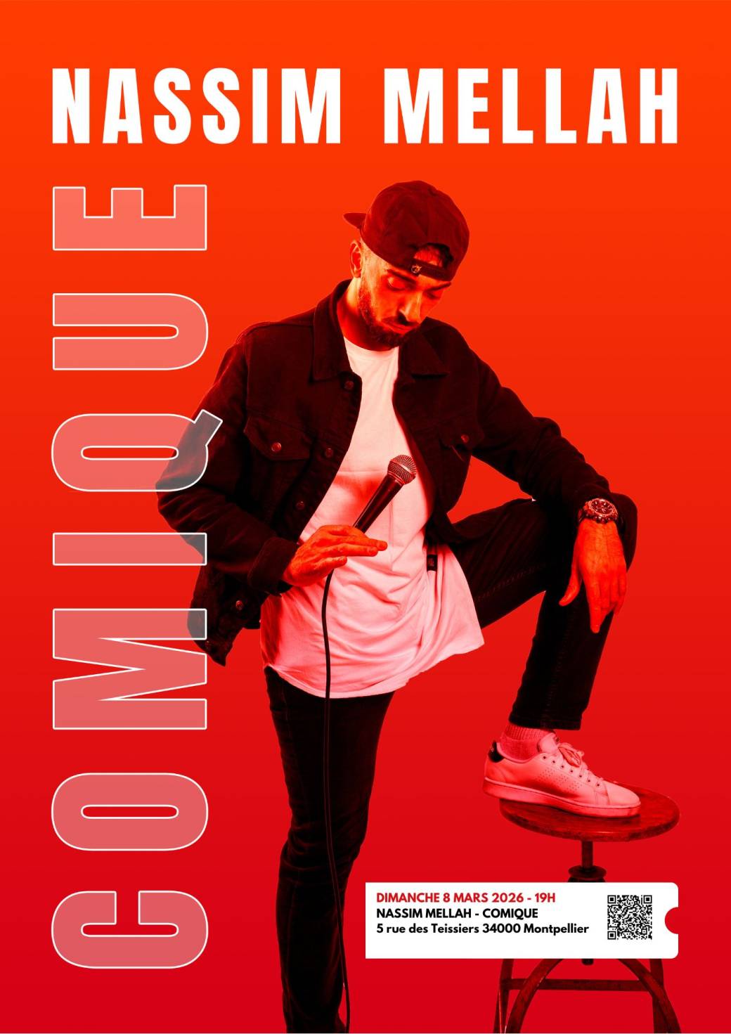 Nassim Mellah, c’est un uppercut d’énergie. Chaque passage sur scène, c’est un sprint contrôlé, un raz-de-marée d’émotions déguisées en vannes.