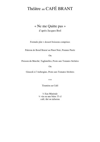 Pour ce nouveau rendez-vous de théâtre musical, la compagnie Théâtre Lumière s’est inspirée de l’œuvre du grand auteur compositeur interprète Jacques Brel. « Ne me Quitte pas » propose un moment de partage artistique avec l’essence même de l’artiste : son écriture si particulière et originale, sa fougue poétique, sa tendresse, ses blessures, sa fragilité, son humour caustique, son humanité et sa jubilatoire et profonde croyance en l’Amour.