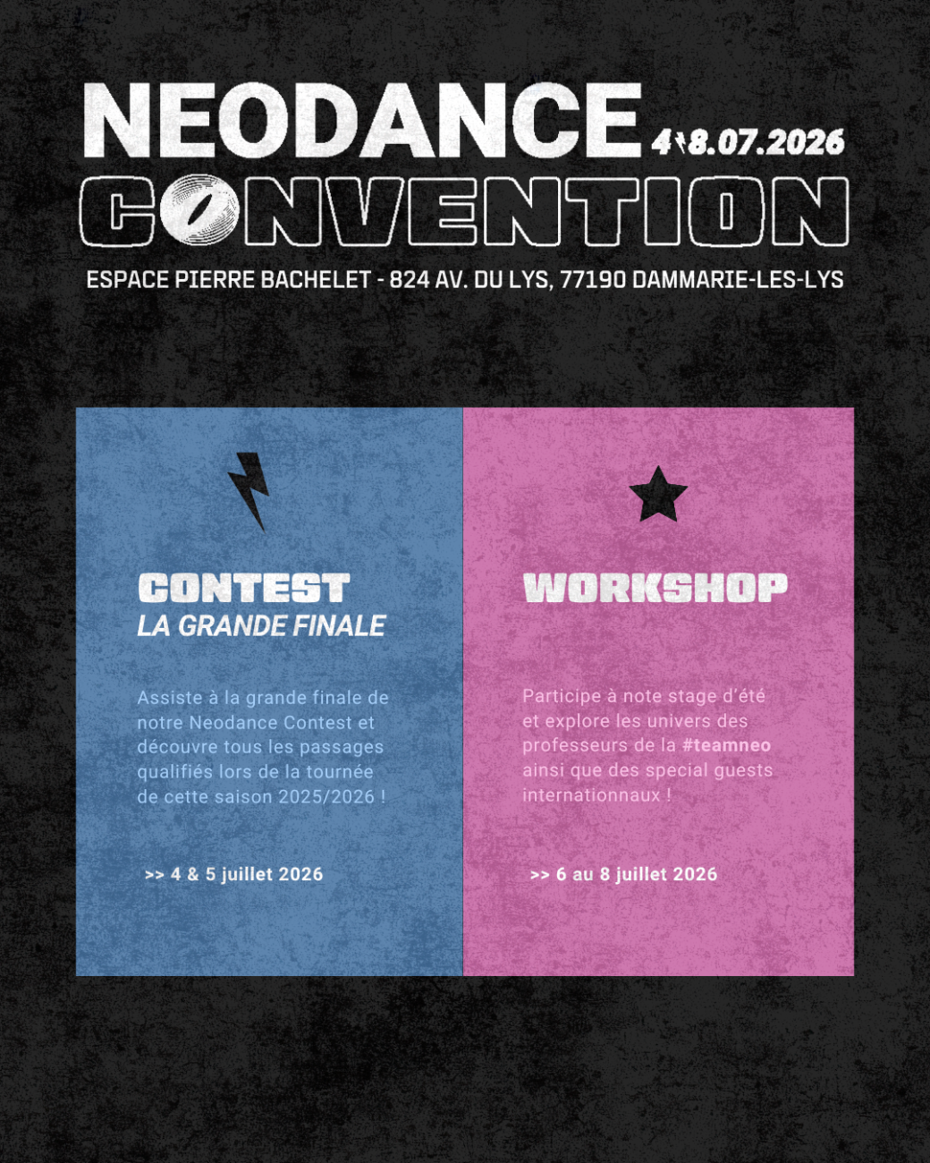 La Neodance Convention 2026 se déroule du 4 au 8 juillet 2026 et regroupe la Grande Finale du Neodance Contest ainsi que 3 jours intensifs de Workshops.