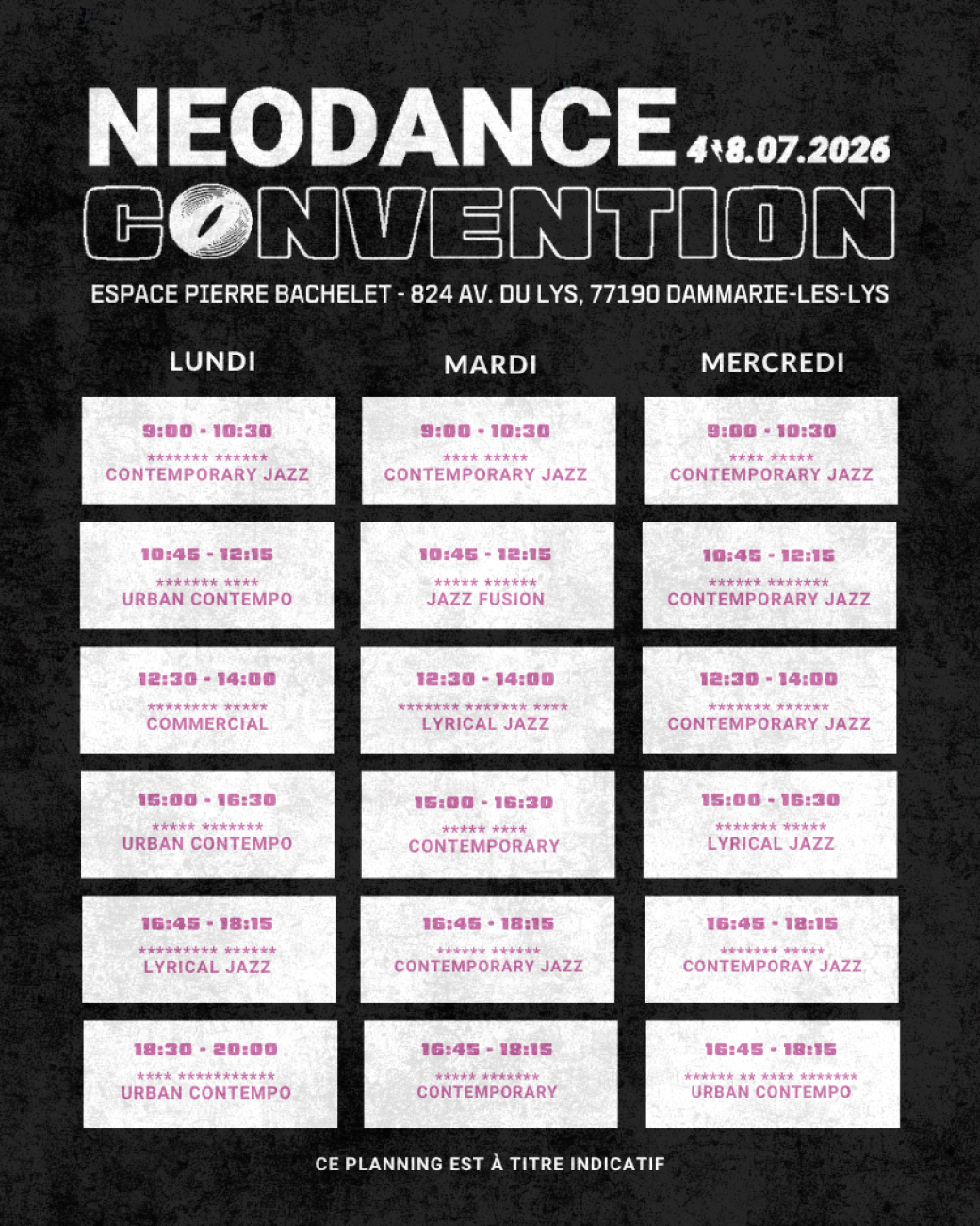 La Neodance Convention 2026 se déroule du 4 au 8 juillet 2026 et regroupe la Grande Finale du Neodance Contest ainsi que 3 jours intensifs de Workshops.