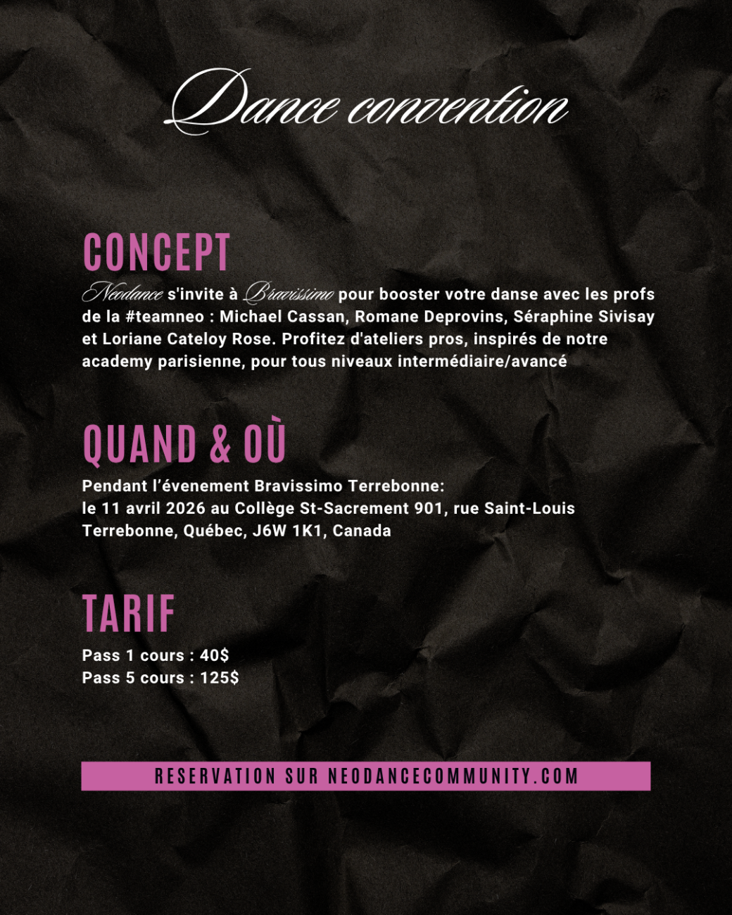 L'événement est organisé par Neodance Academy et son partenaire Bravissimo.