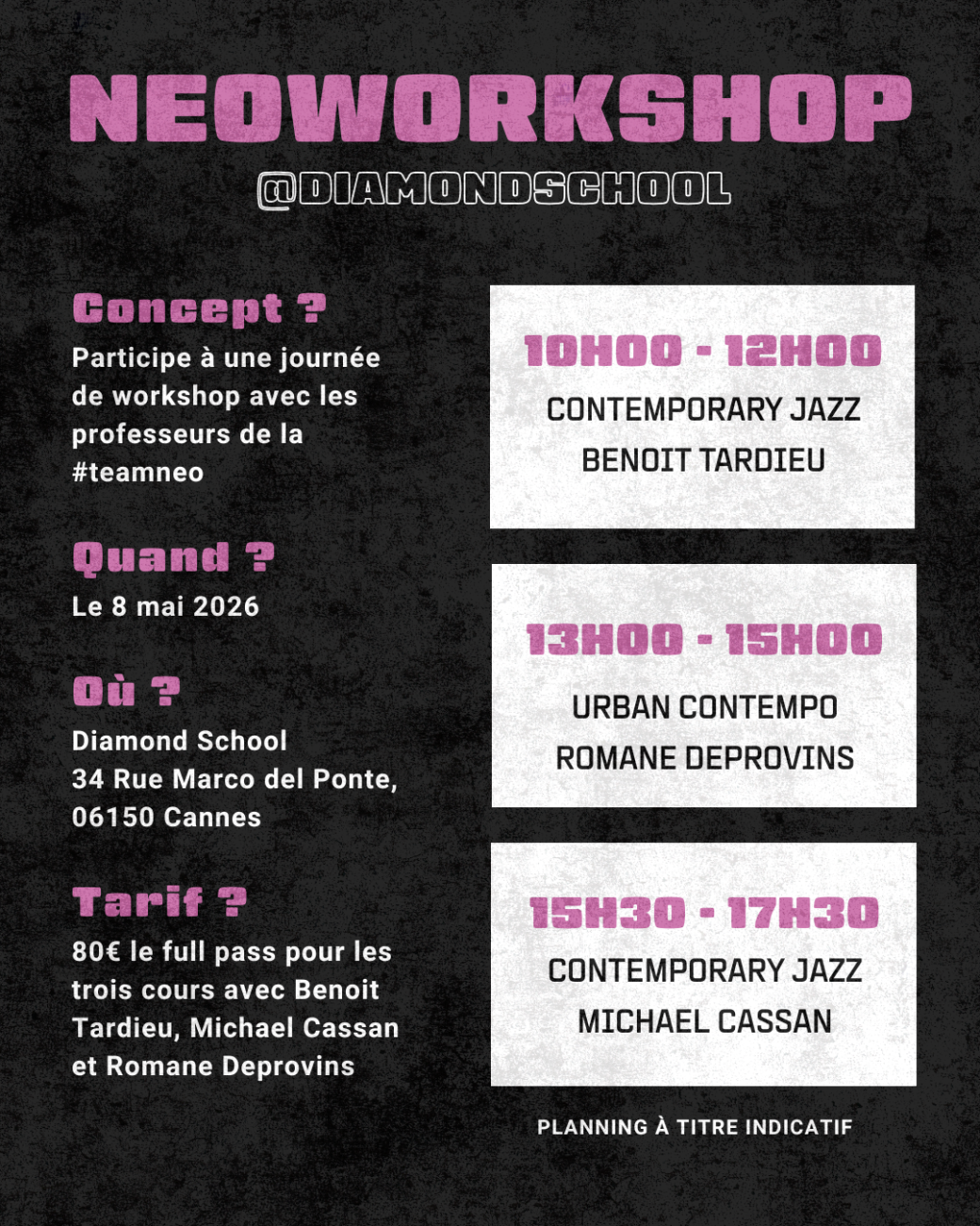 Les horaires suivants sont indicatifs. Le planning définitif vous sera envoyé quelques semaines avant le concours.