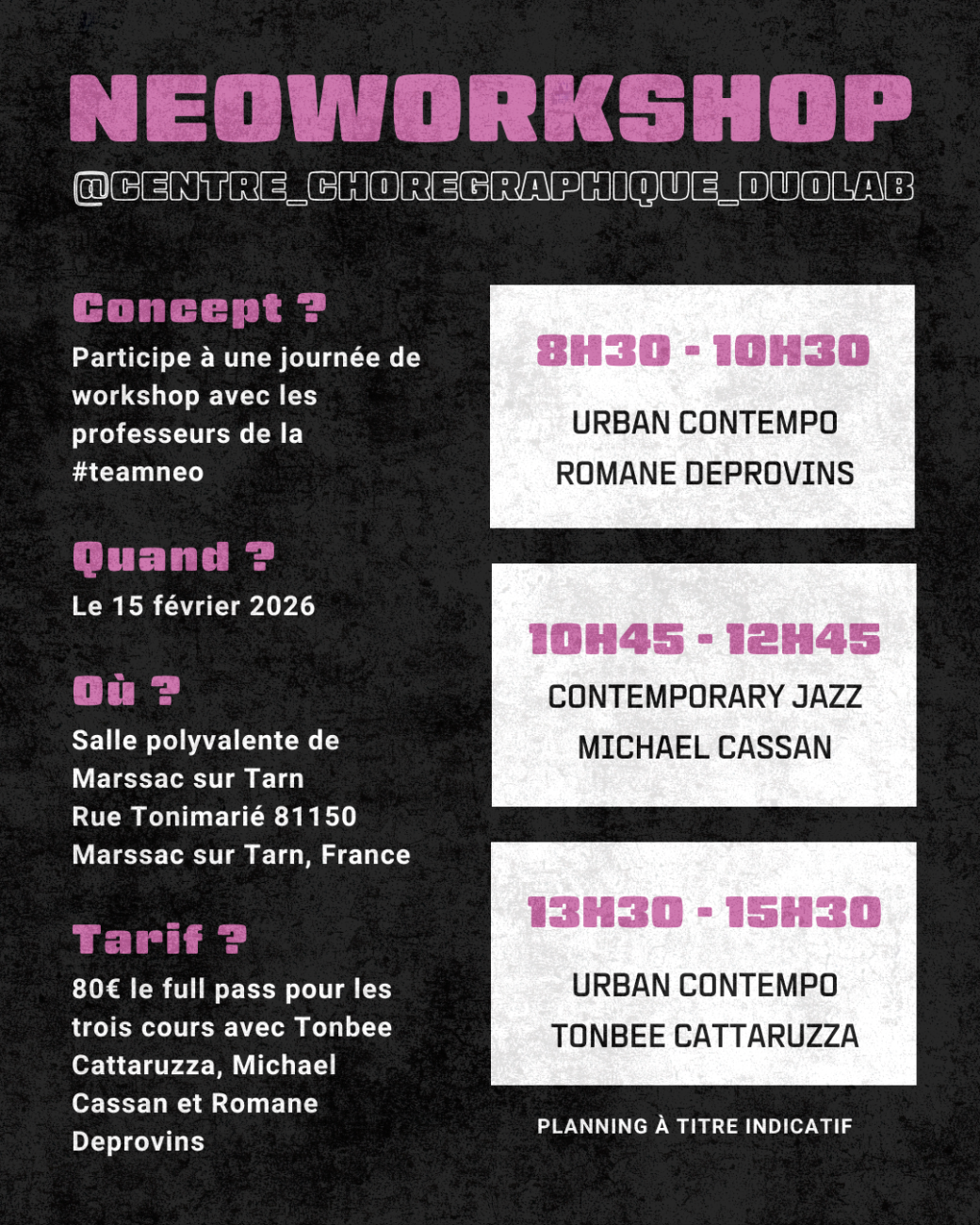 Les horaires sont indicatifs. Le planning définitif vous sera envoyé quelques semaines avant l'événement.