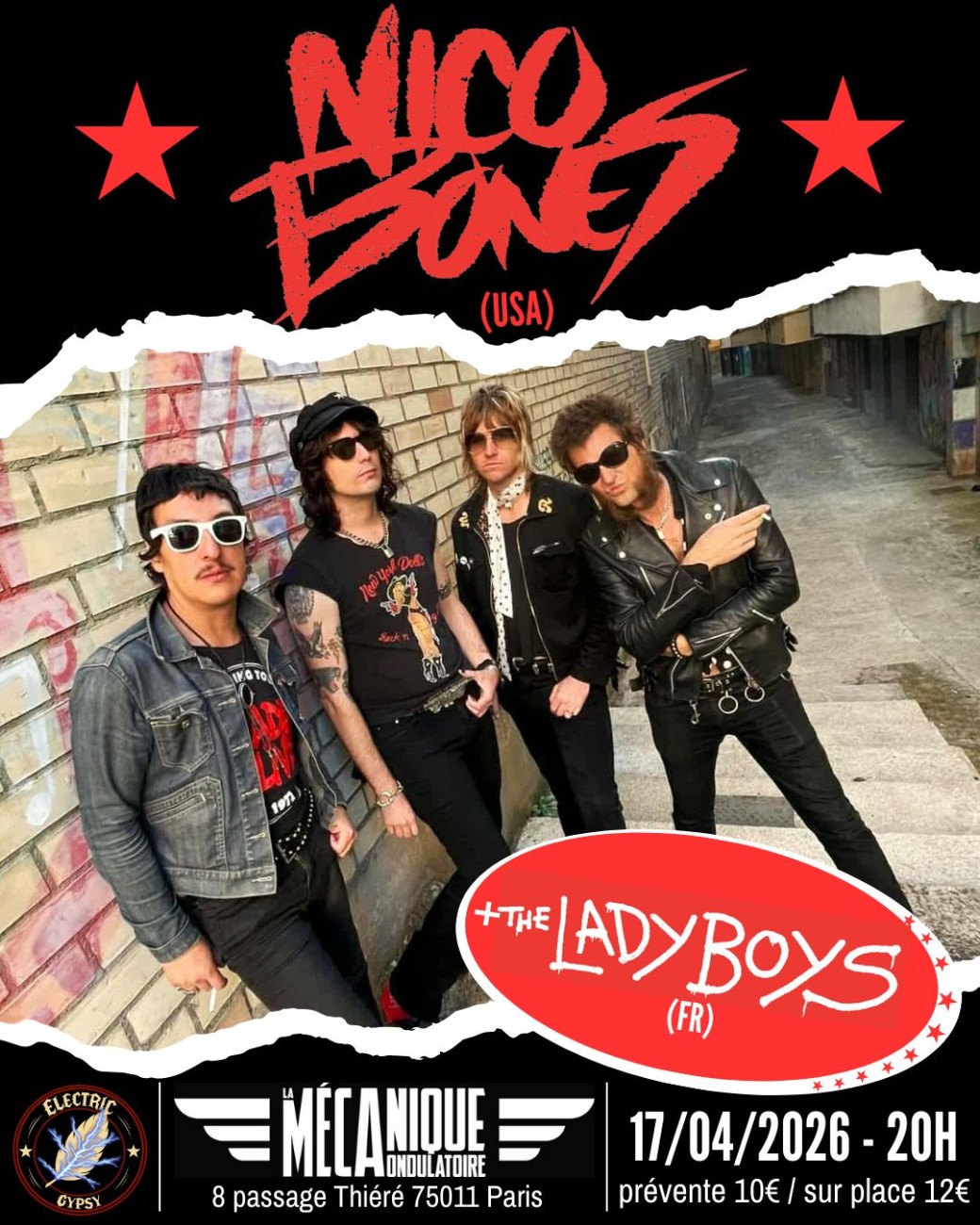 Nico Bones est un groupe californien incandescent, originaire de Los Angeles, né sous le soleil et l'asphalte. Porté par une attitude brute et une présence scénique magnétique, le groupe mélange influences punk, classic rock et glam avec une liberté totale, et une énergie électrique. Leur dernier EP en date, "Sweet Heart Break", produit par Don Bolles et Nico Bones, est sorti sur Wanda Records, Ghost Highway Rec. et Savage Magic Rec. (Le petit circuit punk habituel de la qualité, you know ?!)