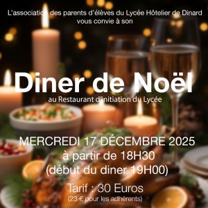 L'association des parents d'élèves du Lycée Hôtelier de Dinard vous convie à son diner annuel de Noël, un repas préparé et servi par les élèves et leurs professeurs
