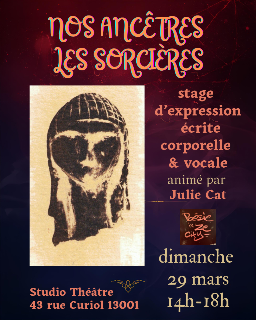 Animé par Julie Cat, poétesse, performeuse et enseignante. À retrouver sur scène ou à la radio (Poésie in Ze City – Radio Galère). Elle transmet une poésie incarnée : les mots qui vibrent, qui bougent et qui relient.