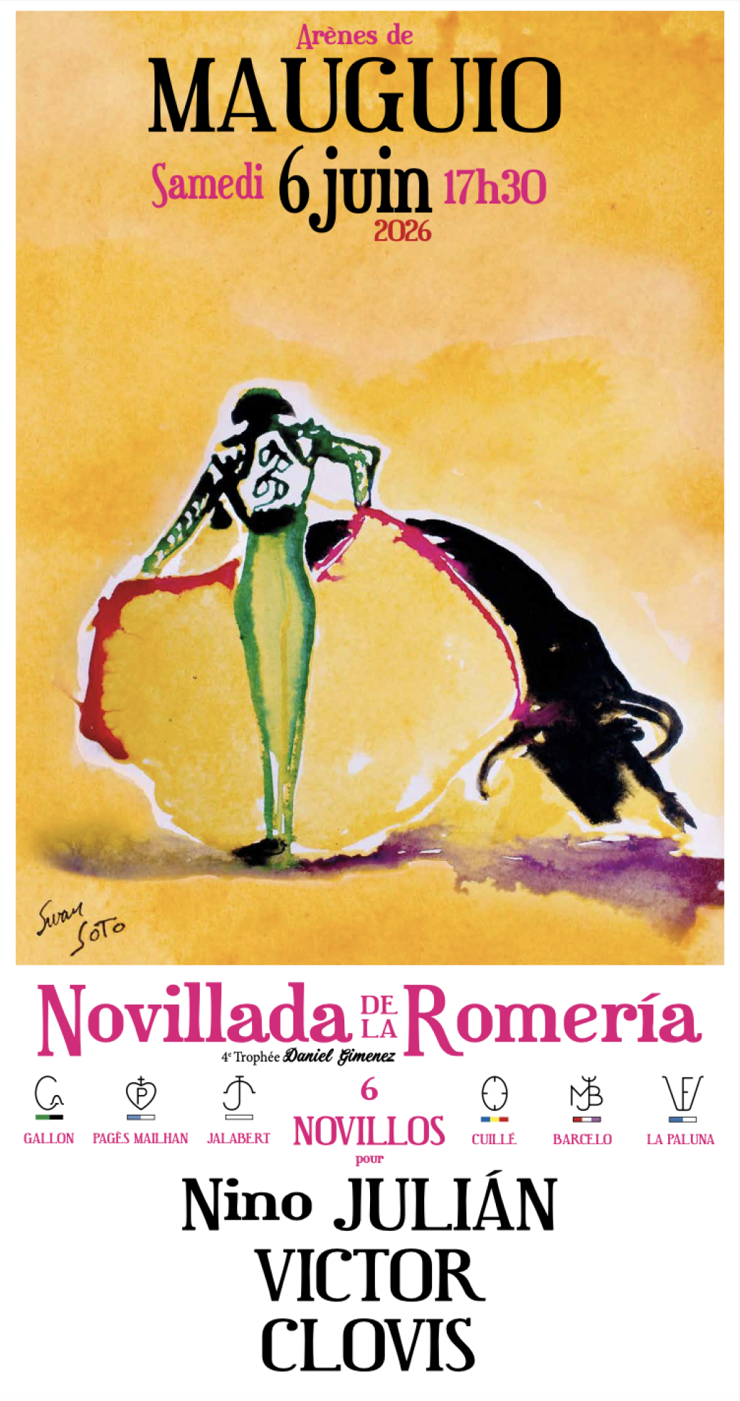 Grande novillada de la Romeria dans les Arènes de Mauguio, samedi 6 juin 2026 à 17h30. 6 novillos des ganaderias Gallon, Jalabert Frères, Pagès-Mailhan, Cuillé, Barcelo et La Paluna. pour les novilleros :
