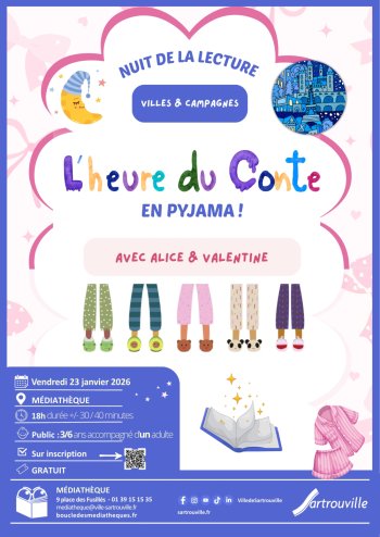 2026-01-23 18:00:002026-01-23 18:35:00Europe/ParisNuit de la lecture / Heure du conte en pyjama à la médiathèqueReservations on : https://www.boucledesmediatheques.fr/Sartrouville