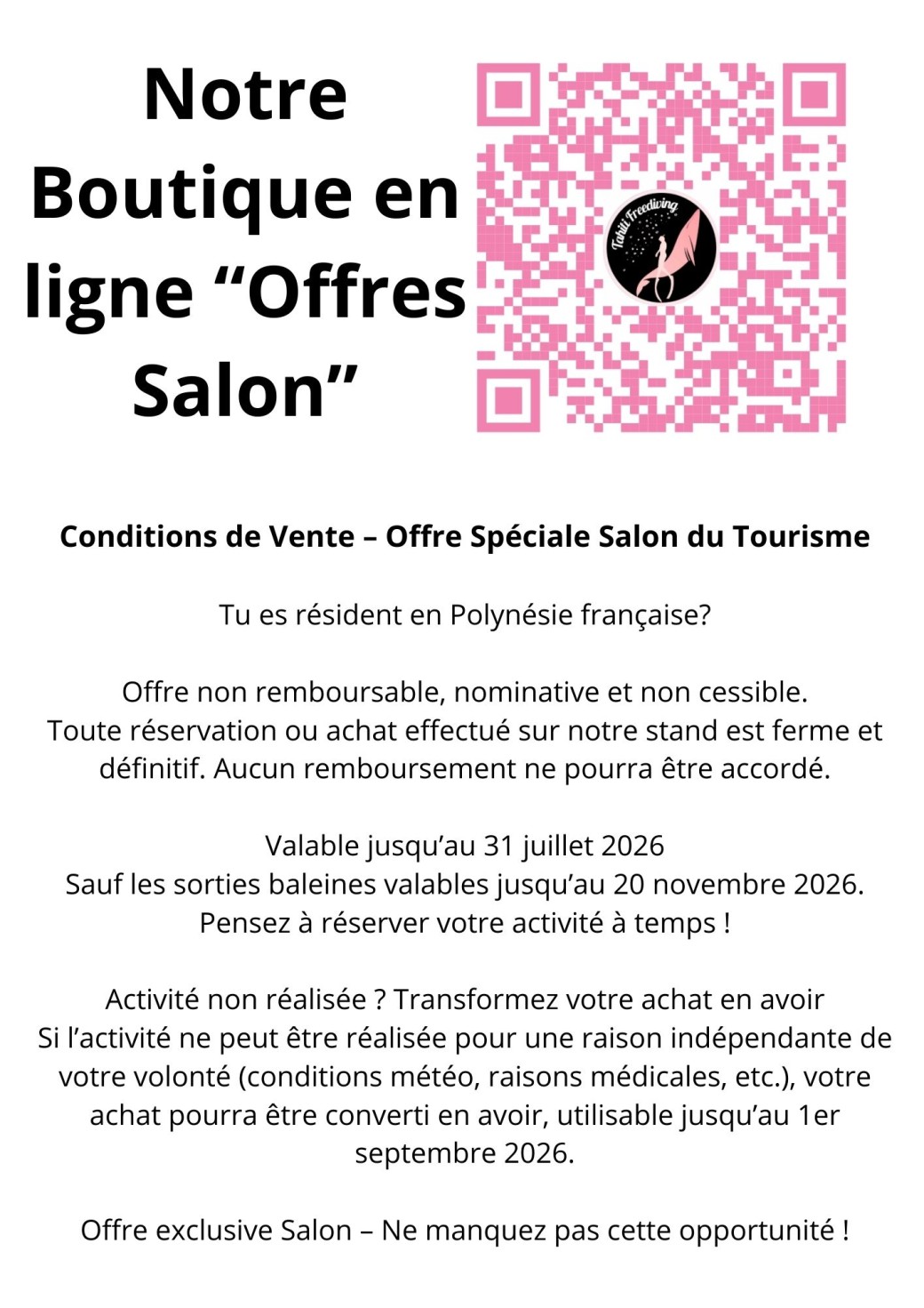 ❗ Toute réservation ou achat effectué sur notre stand est ferme et définitif. Billets non remboursables, sauf en cas de contre-indication médicale justifiée par un certificat (avoir du montant déboursé possible). Les billets sont nominatifs et non cessibles.