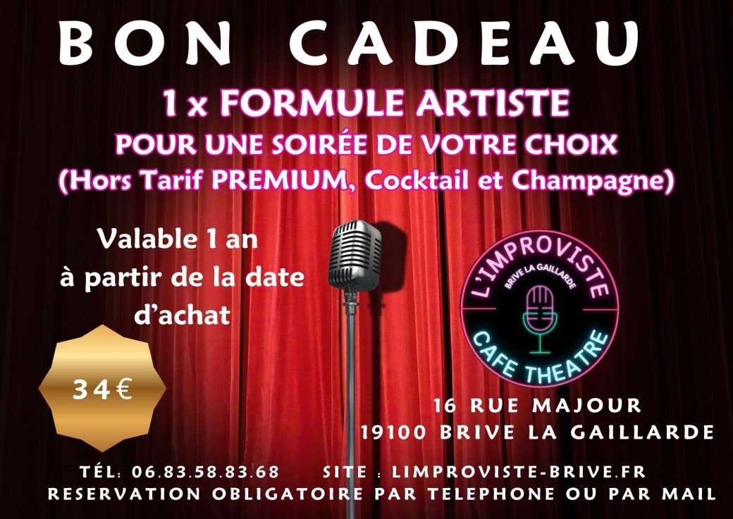 Pour toute information ou pour réserver votre soirée avec votre bon cadeau, contactez-nous au 06 83 58 83 68 ou par mail : limprovistebrive@gmail.com.