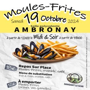 l'OHSJA organise sa traditionnelle journée moules frites le samedi 19 octobre 2024 à la salle polyvalente d'Ambronay (Espace Daniel Bénassy) avec une vente le midi à partir de 12h00 et le soir à partir de 19h, sur place ou à emporter. Soirée dansante avec DJ'Guiz le soir !
