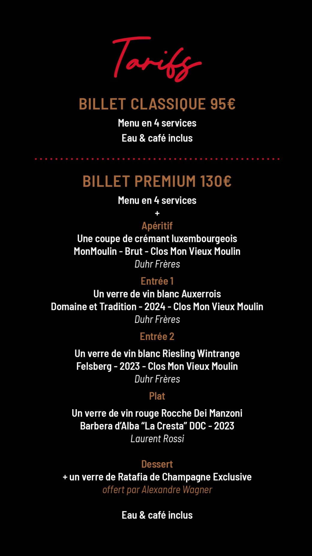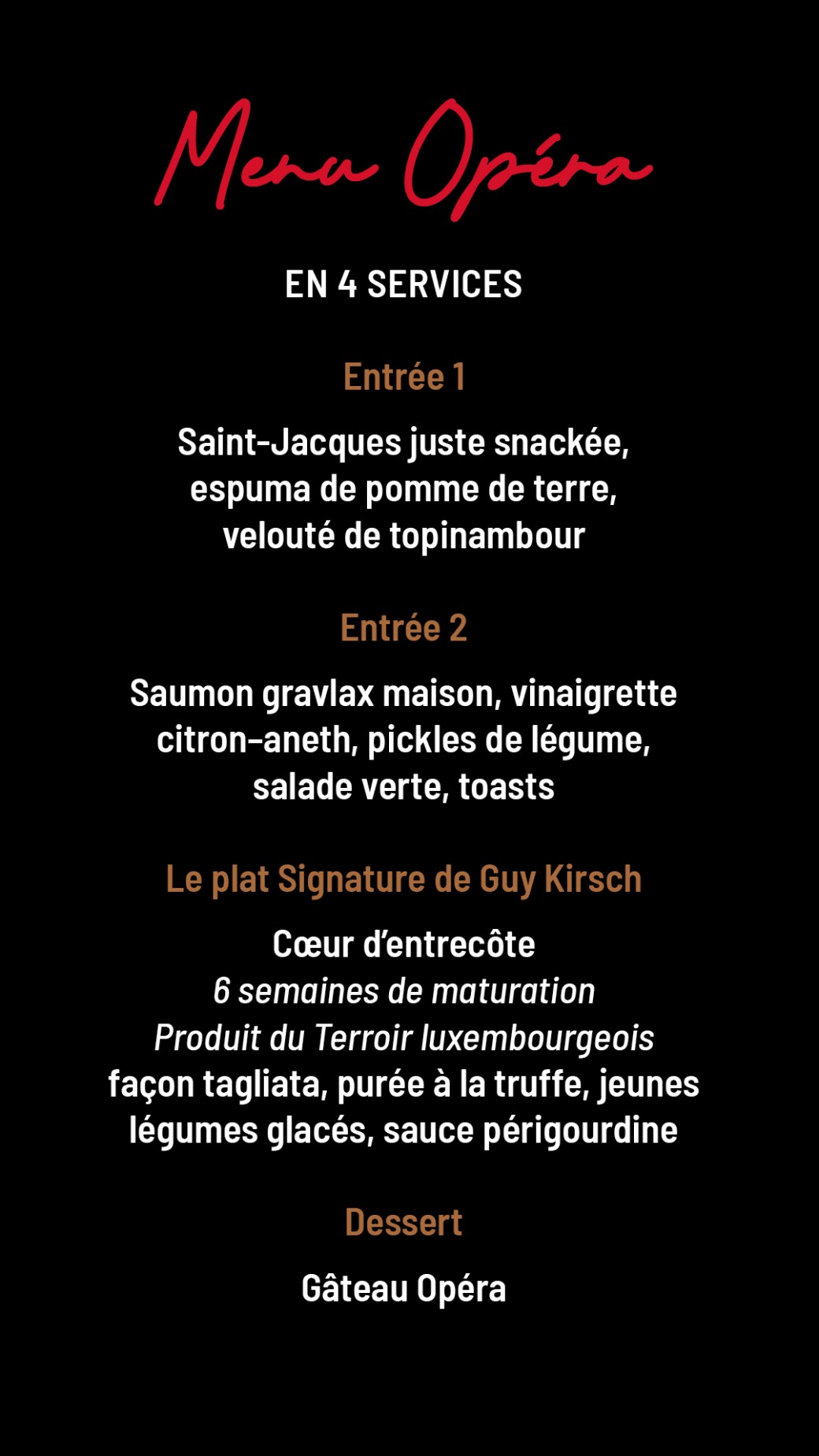 Un Menu Opéra en quatre services, imaginé autour du plat signature de Guy Kirsch et composé de produits du terroir luxembourgeois, sera proposé. Une expérience Premium, avec accords mets et vins soigneusement sélectionnés, est également disponible.