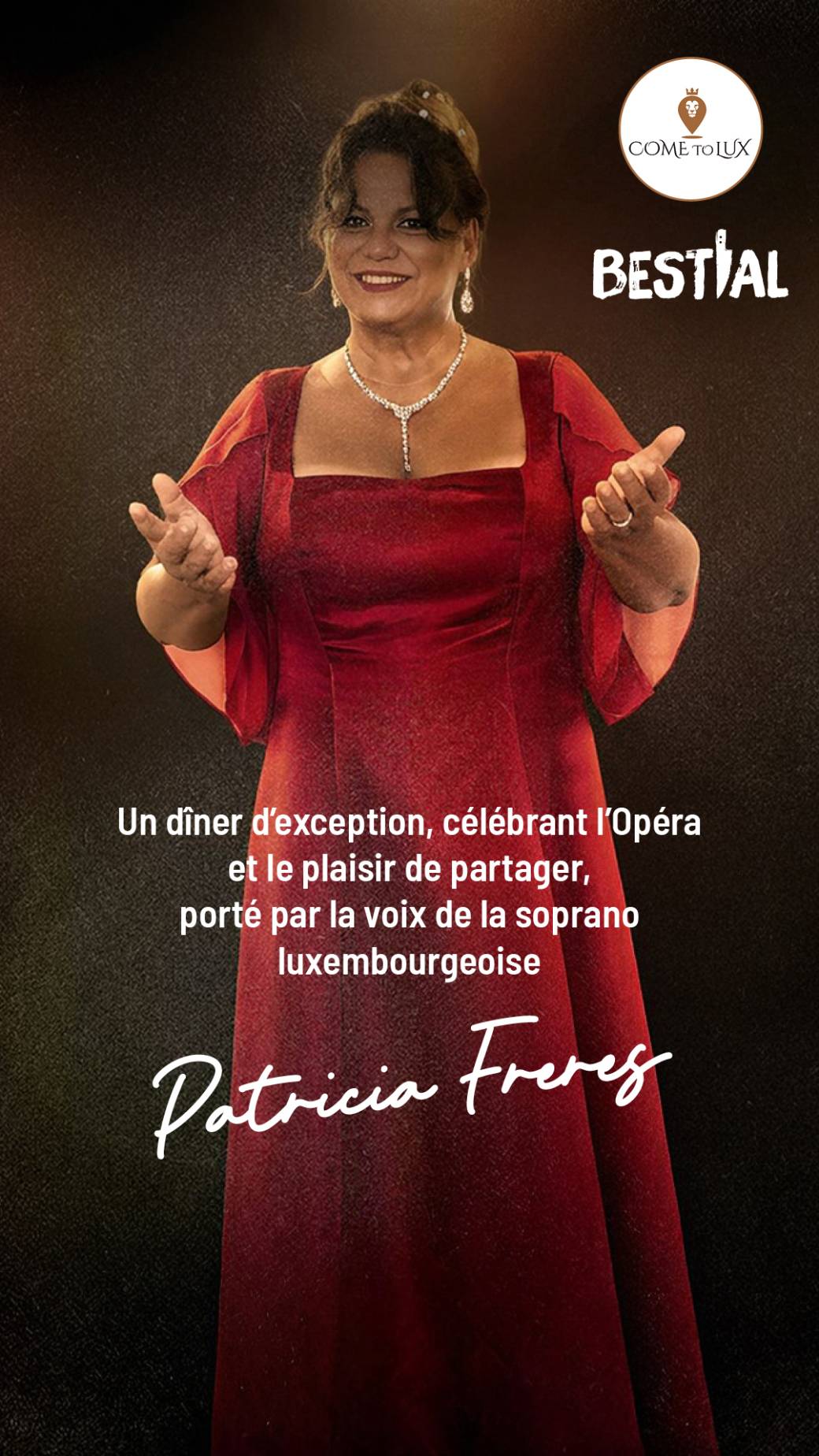 Le jeudi 12 mars à 19h, Guy et Nicole Kirsch ont le plaisir de vous convier à un dîner caritatif unique, célébrant l’Opéra, la gastronomie et le plaisir de partager. Portée par la voix de la soprano luxembourgeoise Patricia Frères, cette soirée promet un moment magique.