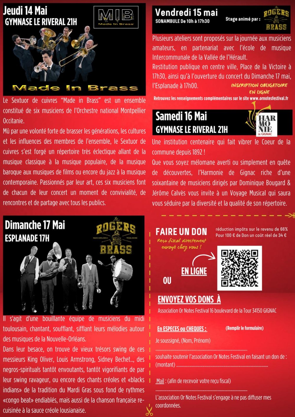 2026-05-15 10:00:00 2026-05-15 17:30:00 Europe/Paris Or Notes Festival : Stage du vendredi Reservations on : https://www.billetweb.fr/or-notes-festival-stage-du-vendredi3 -- Atelier funk avec Roger Brass Plusieurs ateliers sont proposés sur la journée aux musiciens amateurs, en partenariat avec l’école de musique intercommunale de la Vallée de l’Hérault. Ils seront suivis d’une restitution publique en centre ville, place de la Victoire à 17h30, ainsi qu'à l'ouverture du concert du dimanche 17 mai, Place de Verdun (17h30) Le Sonambule, Avenue du Mas Salat, Gignac, France Or Notes Festival