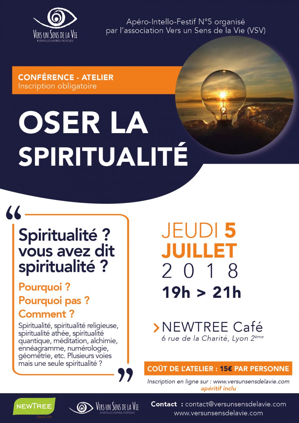 Apéro-Intello-Festif N°5 organisé par l'association Vers un Sens de la Vie (VSV) : jeudi 5 juillet de 19H à 21H au New tree Café 6 Rue de la Charité, 69002.
