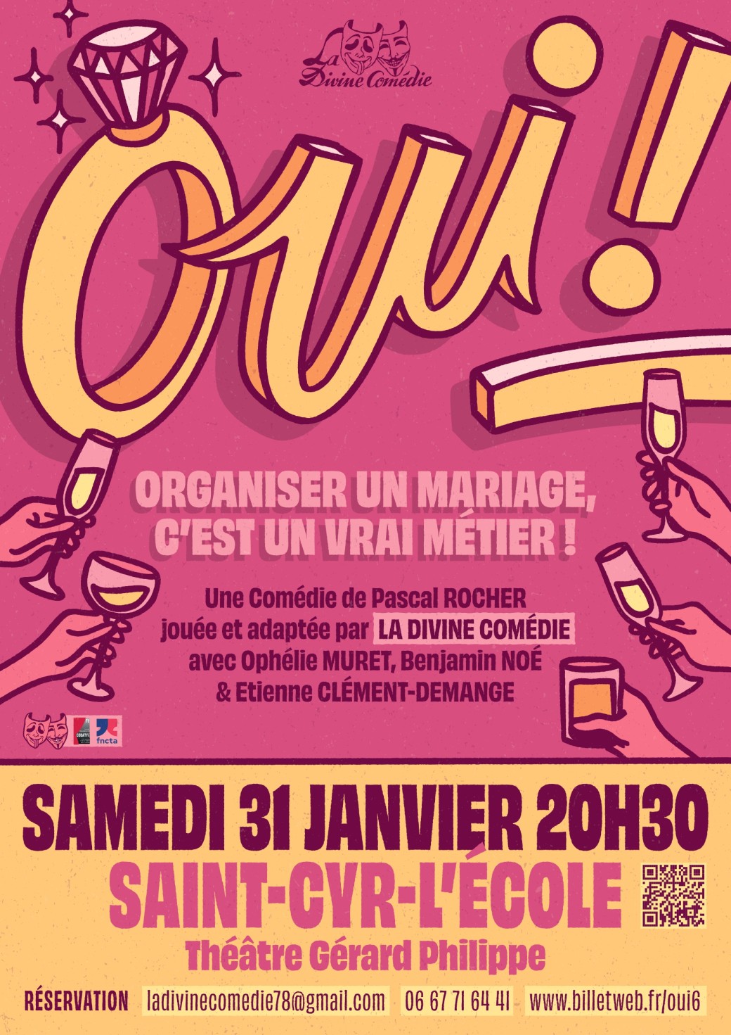 Après 8 ans de vie commune, complètement dépassés par l’organisation de leur mariage, Valérie et Stéphane font appel à un wedding planner car ils ont enfin décidé de se dire Oui ! Walter Craig, célèbre wedding planner parisien, débarque dans leur petit pavillon de banlieue. Une rencontre improbable, explosive... et hilarante!!!Théâtre Gérard Philipe, Rue Gérard Philipe, Saint-Cyr-l'École, FranceLa Divine Comédie