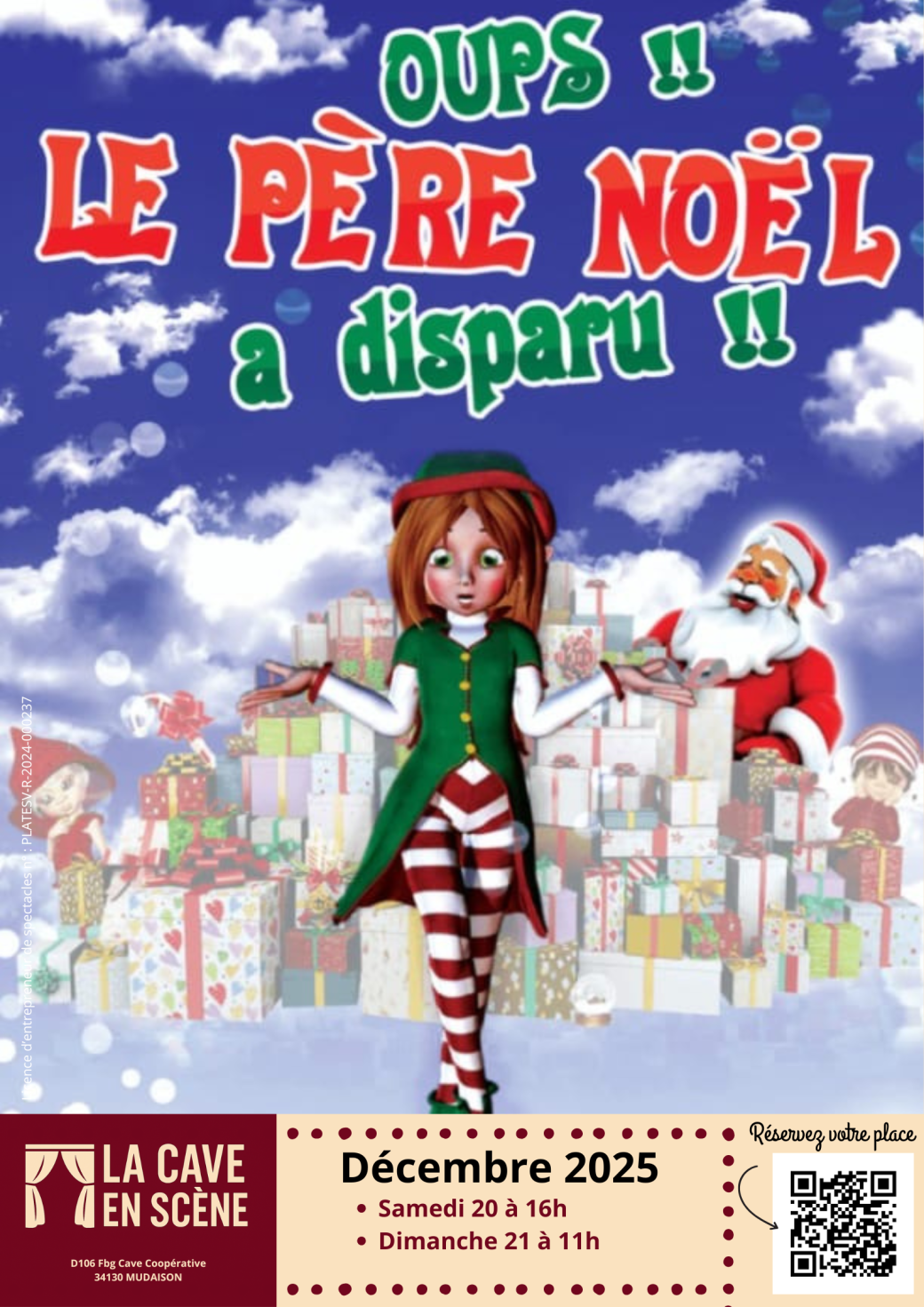 2025-12-21 11:00:00 2025-12-21 12:00:00 Europe/Paris OUPS ! Le Père Noël a disparu Reservations on : https://www.billetweb.fr/oups-le-pere-noel-a-disparu1 -- Pour toute la famille à partir de 18 mois !  ​ Un spectacle drôle et interactif, plein de chansons de Noël et de rebondissements ! Lulu la Lutine est inquiète : le Père Noël a disparu ! Elle part à sa recherche et tout au long de son aventure, va rencontrer de nombreux personnages étonnants : un daim, un lutin, le Père Fouettard, et même un ange… Mais pourront-ils l’aider à retrouver le Père-Noël ? ​​ Artistes : Jean Blanc La Cave, Faubourg Cave Coopérative, Mudaison, France La Cave en scène