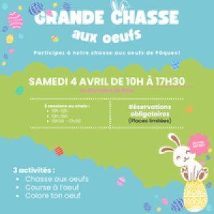 Un moment ludique et convivial pour les enfants de 3 à 10 ans. Chaque session accueille 30 enfants maximum, répartis en 3 groupes de 10 pour profiter pleinement des activités : chasse aux œufs, atelier décoration et course à l’œuf.