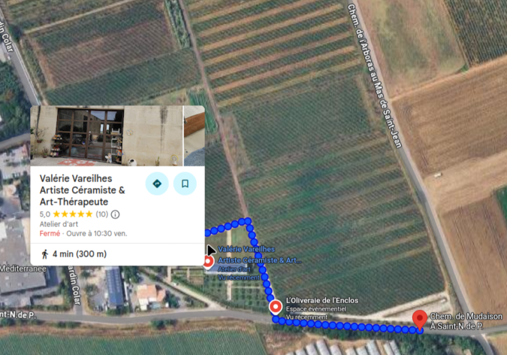 Ci-dessous le plan pour venir nous rejoindre. Parking de L' Oliveraie, en rentrant à droite, puis suivre le chemin en bleu qui vous mènera au départ de l'aventure. (Atelier de Valérie Vareilhes - Céramiste - Co-organisatrice)