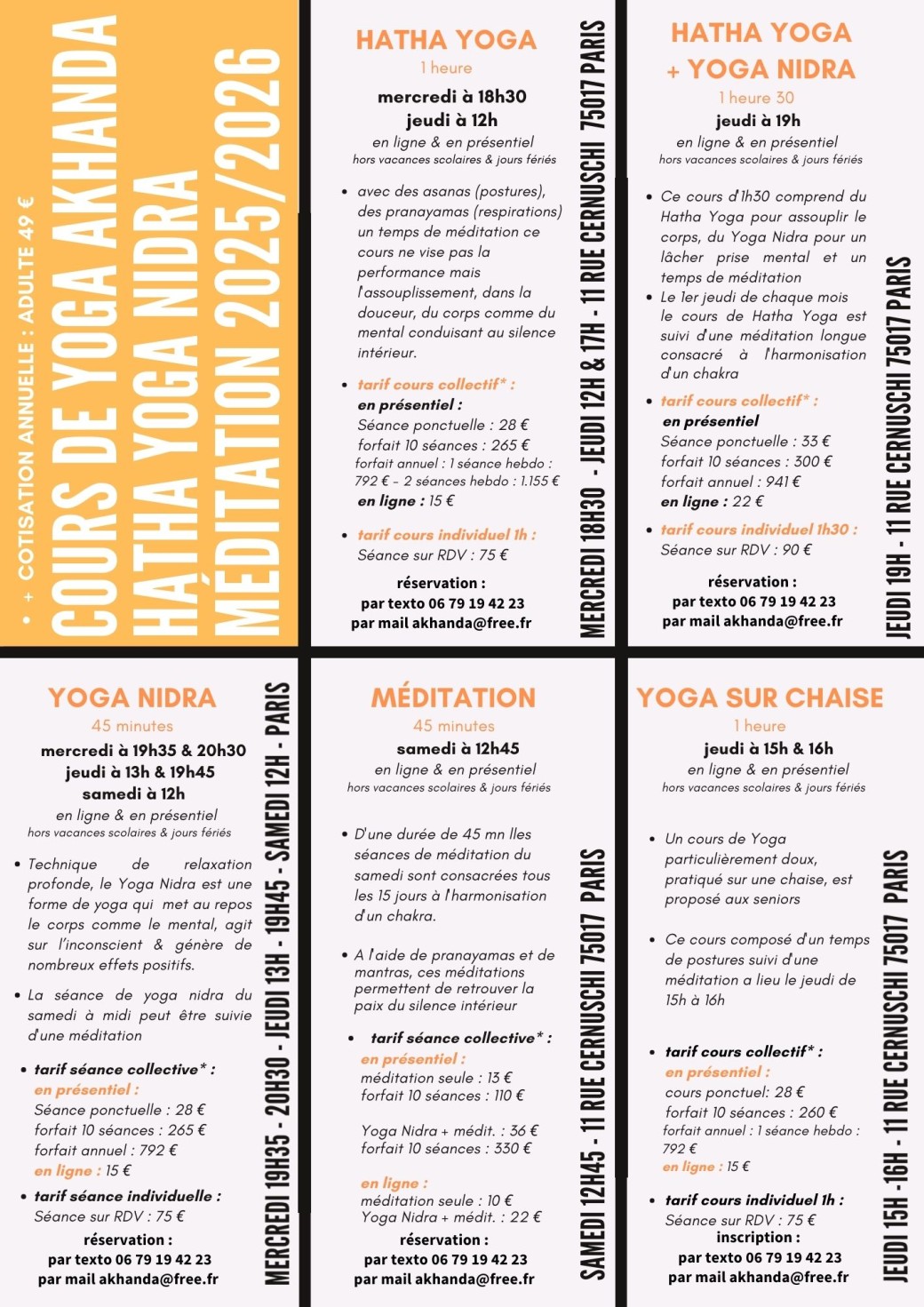 ce pass vous donne droit à un cours de Hatha Yoga, une séance de Yoga Nidra et une séance de méditation à prendre en ligne (via zoom) ou en présentiel, en petits groupes (maximum 6 personnes) - 11 rue Cernuschi 75017 Paris, entre le 17 septembre 2025 et le 20 juin 2026