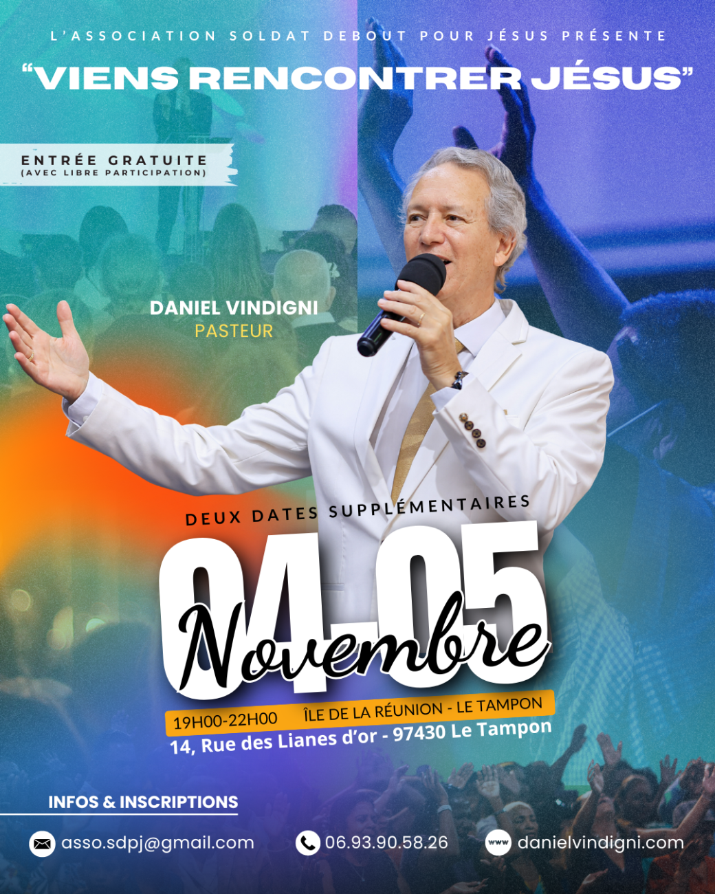 Dans la continuité de la grâce divine en cours, l’Association SDPJ, en collaboration avec le ministère S.P.M (Salut pour le Monde) vous convient à deux nouvelles rencontres les 4 et 5 novembre 2025 dans le sud de l'île au Tampon, au sein de l'église C.A.P.C., où l'apôtre Luc et son équipe nous accueilleront avec bienveillance.