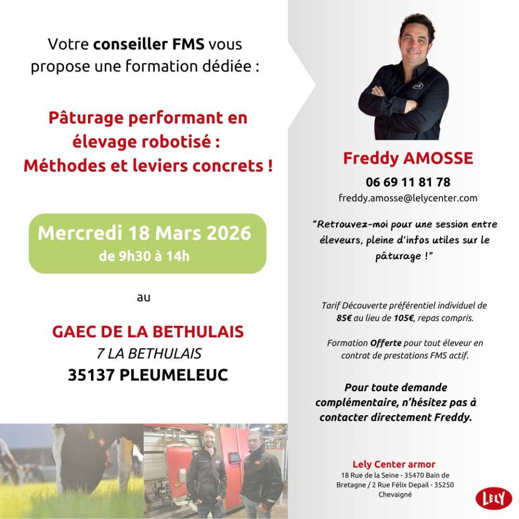 Cette session s’adresse aux éleveurs Lely équipés souhaitant optimiser l’utilisation du pâturage tout en maintenant la performance du troupeau et du robot. À travers des exemples concrets, retours d’expérience et échanges entre éleveurs.