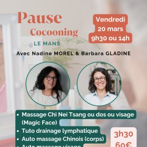 2026-03-20 09:30:00 2026-03-20 12:30:00 Europe/Paris Pause cocooning 20/3 - 9h30 Reservations on : https://www.billetweb.fr/pause-cocooning-20-3-9h30 -- Offrez-vous une parenthèse profondément ressourçante avec la Pause Cocooning, un atelier pensé pour relâcher les tensions, apaiser le mental et reconnecter le corps à son énergie vitale.   Massage Chi Nei Tsang ou dos ou visage (Magic Face) Tuto drainage lymphatique Auto massage Chinois (corps) Auto massage visage Tuto skincare Mesurer votre niveau de stress Cohérence cardiaque et méditation   Un moment intime, doux et puissant, pour se recentrer et repartir légère, alignée et profondément détendue.   Deux créneaux disponibles : 9h30 ou 14h   Groupe limité à 6 participantes pour une expérience personnalisée 69 Rue Henri Champion, Le Mans, France barbara gladine EI