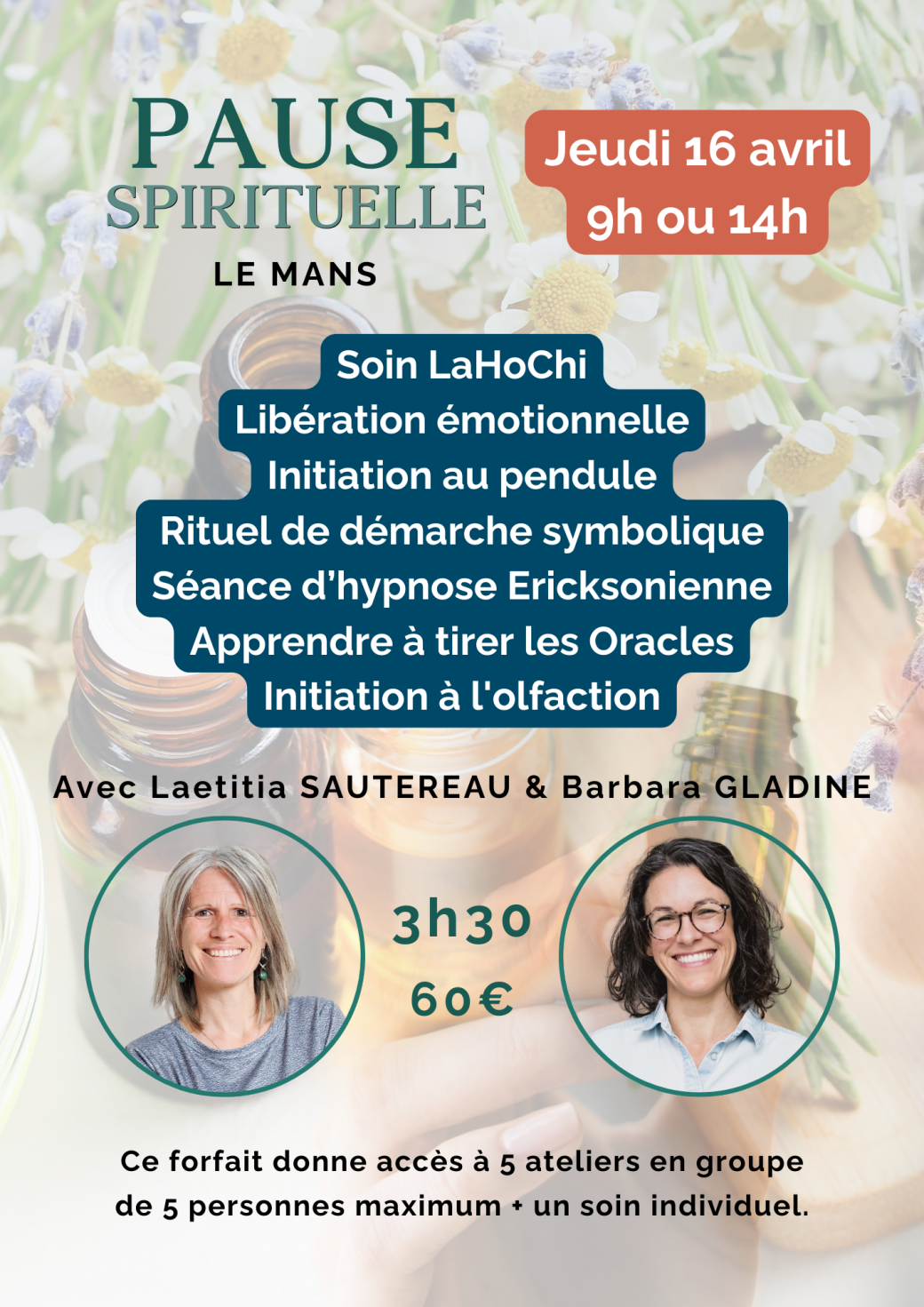 2026-04-16 09:00:00 2026-04-16 12:30:00 Europe/Paris Pause spirituelle 16/4 - 9h Reservations on : https://www.billetweb.fr/pause-spirituelle-16-4-9h -- Avec Laetitia Sautereau nous t’invitons à un moment suspendu où le cœur, le corps et l’âme s’alignent. Dans un petit groupe intimiste (5 à 6 personnes), tu exploreras ton monde intérieur à travers des ateliers puissants.   Au programme :  Soin LaHoChi Libération émotionnelle Initiation au pendule Rituel de démarche symbolique Séance d’hypnose Ericksonienne Apprendre à tirer les Oracles Initiation à l'olfaction   Une expérience unique pour retrouver le calme et liberer nos émotions en douceur.   Le Mans Sud (adresse communiquée à la réservation)   60 € – Places très limitées ! Ce forfait donne accès à 5 ateliers en petit groupe + 1 soin individuel.   Prête à embarquer pour ce voyage intérieur ? 69 Rue Henri Champion, Le Mans, France barbara gladine EI