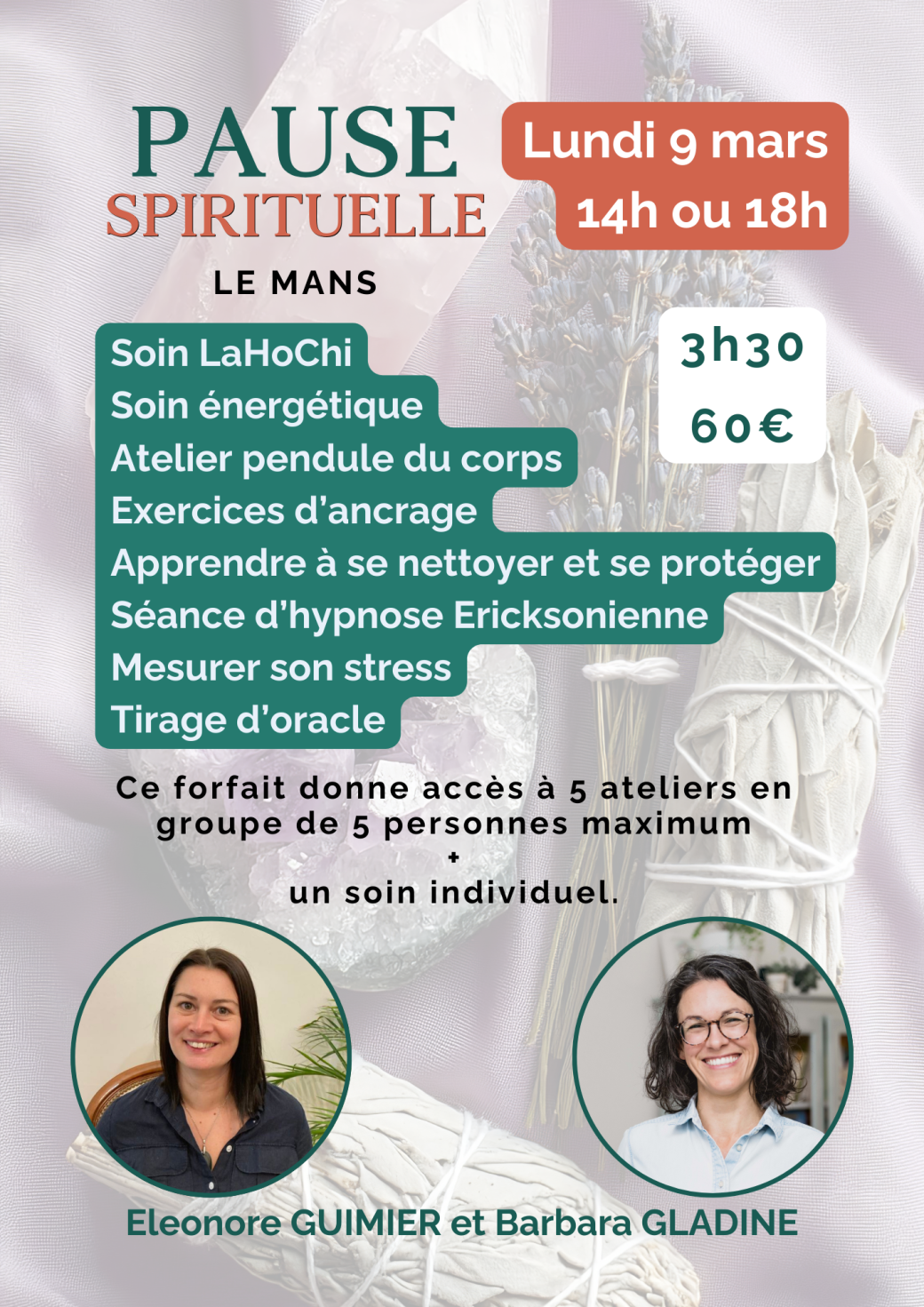 Avec Eleonore GUIMIER nous t’invitons à un moment suspendu où le cœur, le corps et l’âme s’alignent. Dans un petit groupe intimiste (5 à 6 personnes), tu exploreras ton monde intérieur à travers des ateliers puissants.