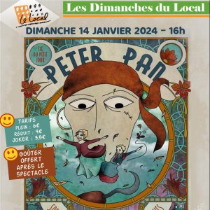 2024-01-14 16:00:00 2024-01-14 17:30:00 Europe/Paris Peter Pan par la Cie du Petit Jour Reservations on : https://www.billetweb.fr/peter-pan15 -- Dès 4 ans :   Et la chambre se transforme en pays imaginaire ! Un pays de magie peuplé d'affreux pirates, d'une petite fée jalouse, de sirènes mal embouchées, de vieux indiens belliqueux, de garçons perdus. Un pays où Wendy vivra de folles aventures jusqu'à l'aube.   Un tourbillon de rire et de poésie.   par la Cie du Petit Jour Salle de Spectacle du Local 16 rue Saint-Pierre-Le Puellier 86000 Poitiers       Centre socio-culturel "Le Local", Rue Saint-Pierre-le-Puellier, Poitiers, France Le Local