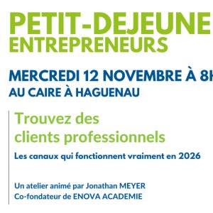 Le mercredi 12 novembre 2025 à 8h30, nous aurons le plaisir d'accueillir Jonathan Meyer, fondateur d’Enova Académie, pour une conférence dynamique et concrète : « Trouvez des clients professionnels »